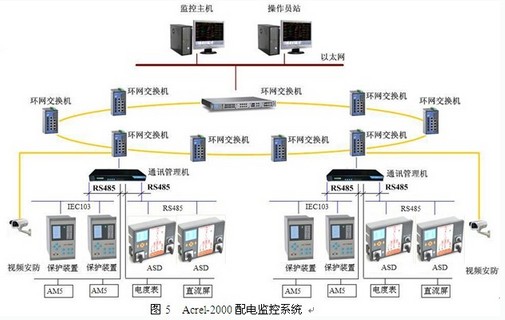 在圖3的供電方案下,選用安科瑞電氣股份有限公司的Acrel-2000配電監(jiān)控系統(tǒng),并配備安科瑞公司的微機(jī)保護(hù)裝置、開(kāi)關(guān)柜綜合測(cè)控裝置、多功能電力儀表等設(shè)備,實(shí)現(xiàn)智能的終端用戶變電站配電自動(dòng)化系統(tǒng)。其中配備的AM5系列保護(hù)測(cè)控裝置集保護(hù)、測(cè)量、控制于一體,針對(duì)不同一次設(shè)備可以靈活配置不同的保護(hù)功能,可以實(shí)現(xiàn)35kV及以下電壓等級(jí)變配電站全面保護(hù)測(cè)控功能,適用于線路、母聯(lián)、配電變壓器、高壓電動(dòng)機(jī)、高壓電容器等設(shè)備的保護(hù)和自動(dòng)控制功能。裝置采用先進(jìn)成熟可靠的保護(hù)原理和算法,抗干擾性能強(qiáng),可靠性高,保護(hù)實(shí)現(xiàn)方式靈活,通訊采用冗余設(shè)計(jì)。裝置采用全圖形化編程技術(shù),可以根據(jù)需要對(duì)裝置進(jìn)行邏輯編程,滿足多數(shù)用戶的要求。如果保護(hù)測(cè)控裝置在使用過(guò)程中需要更換保護(hù)功能,只需通過(guò)裝置的維護(hù)端口更新內(nèi)置邏輯圖即可,實(shí)現(xiàn)方式簡(jiǎn)單靈活。