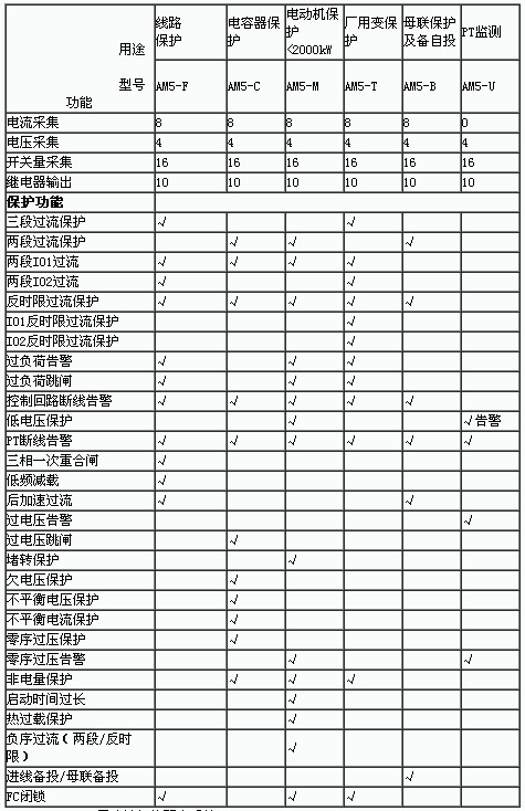 為了能準(zhǔn)確采集供電系統(tǒng)的電參量信號(hào)與非電量信號(hào),實(shí)現(xiàn)供電系統(tǒng)的全面保護(hù)和測(cè)控,在一次系統(tǒng)里合理配置了安科瑞電氣股份有限公司的AM5系列保護(hù)裝置和ASD系列開(kāi)關(guān)柜綜合測(cè)控裝置,以確保供電系統(tǒng)穩(wěn)定可靠運(yùn)行,具體包括:2個(gè)主供電源進(jìn)線側(cè)開(kāi)關(guān)柜上選配AM5-F進(jìn)線保護(hù)裝置;冷凍機(jī)房側(cè)開(kāi)關(guān)柜上選配AM5-M電動(dòng)機(jī)保護(hù)裝置;變壓器出線柜上選配AM5-T變壓器保護(hù)裝置;一般出線柜上選配AM5-F進(jìn)線/饋線保護(hù)裝置;PT柜上選配AM5-U PT監(jiān)測(cè)裝置等。各裝置外形與功能說(shuō)明見(jiàn)表4,其中AM5系列保護(hù)裝置詳細(xì)功能可參見(jiàn)表5。