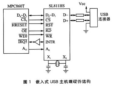 嵌入式USB主機(jī)硬件結(jié)構(gòu)比較簡單,只是在嵌入式微處理器外部加上USB主控芯片即可。在本項(xiàng)目中,嵌入式微處理器采用的是Motorola公司的MPC860T,USB主控制芯片采用的是SL811HS芯片。SL81lHS芯片是Cypress公司生產(chǎn)的、可支持全速數(shù)據(jù)傳輸?shù)腢SB控制芯片,芯片內(nèi)含USB主,主/從控制器,支持全速(full speed)/低速(low speed)數(shù)據(jù)傳輸,并能自動(dòng)識(shí)別全速或低速設(shè)備。SL811HS所提供的接口遵從USBl.1標(biāo)準(zhǔn)。關(guān)于SL811HS更詳細(xì)的使用方法請見參考文獻(xiàn)[3]。使用SL811HS作為嵌入式USB主機(jī)控制器的系統(tǒng)硬件結(jié)構(gòu)如圖1所示。