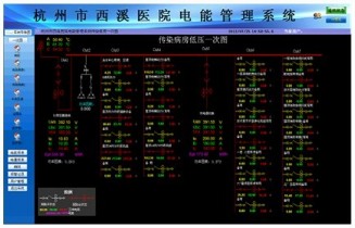 19寸彩色液晶顯示作為人機(jī)交互界面,實(shí)時(shí)顯示配電系統(tǒng)各種信息畫面,包括各斷路器當(dāng)前狀態(tài)、各回路當(dāng)前電壓、電流、功率等測(cè)量值的實(shí)時(shí)信息。聲光提示報(bào)警信息、保護(hù)設(shè)備動(dòng)作及復(fù)位信息。圖三所示為傳染病房低壓一次配電系統(tǒng)圖: