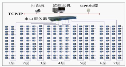 為滿(mǎn)足樓層和配電室統(tǒng)一監(jiān)控的要求,現(xiàn)場(chǎng)所有儀表通過(guò)屏蔽雙絞線(xiàn)連接至串口服務(wù)器,進(jìn)而實(shí)現(xiàn)對(duì)現(xiàn)場(chǎng)數(shù)據(jù)的采集,存儲(chǔ),處理,實(shí)時(shí)顯示以及歷史查詢(xún),拓?fù)浣Y(jié)構(gòu)如圖1: