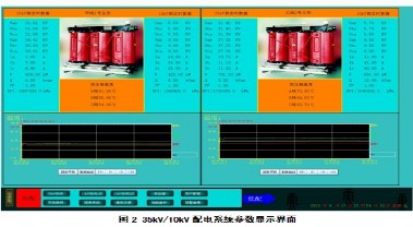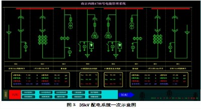?。?)35kV/10kV配電系統(tǒng)一次示意圖:除了顯示配電系統(tǒng)的常規(guī)參數(shù)外,配電室主機的電能管理系統(tǒng)還以配電系統(tǒng)一次圖的形式繪制了軟件界面,通過標(biāo)注回路用途,使配電系統(tǒng)的走向更為清晰化,35KV配電系統(tǒng)一次示意圖如圖3所示。此外,電壓、電流等常規(guī)電參量也可以在一次示意圖界面上查看。
