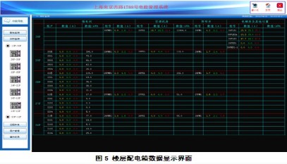 (4)樓層配電箱數(shù)據(jù)采集及顯示(如圖5所示):樓層電能管理主機采集1788中心B3F~30F各處配電箱上儀表的數(shù)據(jù),以樓層劃分,按照配電箱所處位置和編號對數(shù)據(jù)進行排序,分類顯示租戶、空調(diào)和風(fēng)機回路的三相電流和有功電度,顯示照明、應(yīng)急照明、動力、電梯、水泵和一些其他回路的三相電流。
