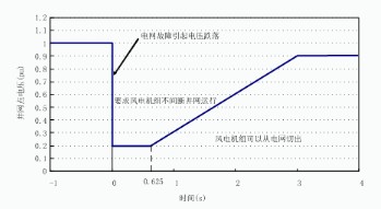 風(fēng)電場(chǎng)并網(wǎng)點(diǎn)電壓在圖中電壓輪廓線及以上的區(qū)域內(nèi)時(shí),場(chǎng)內(nèi)風(fēng)電機(jī)組必須保證不間斷并網(wǎng)運(yùn)行;并網(wǎng)點(diǎn)電壓在圖中電壓輪廓線以下時(shí),場(chǎng)內(nèi)風(fēng)電機(jī)組允許從電網(wǎng)切出2.