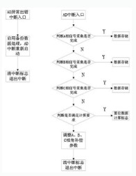 MCF51EM256每一路AD模塊均具有A和B 2個(gè)通道輸入,任一通道采集完成后通過內(nèi)置PDB模塊調(diào)整自動(dòng)切換時(shí)間,實(shí)現(xiàn)電壓、電流相角差調(diào)整來達(dá)到功率補(bǔ)償功能,該方法簡(jiǎn)單可行,中斷同時(shí)需對(duì)AD異常做出處理,現(xiàn)給出AD中斷處理程序流程。