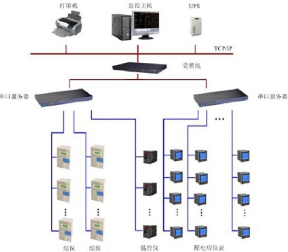 ?。?)通訊間隔層(網(wǎng)絡(luò)通訊層)采用通訊管理機,負責(zé)與現(xiàn)場設(shè)備層的各類裝置進行通訊,采集各類裝置的數(shù)據(jù)、參數(shù),進行處理后集中打包傳輸?shù)街髡緦?,同時作為中轉(zhuǎn)單元,接受主站層下發(fā)的指令,轉(zhuǎn)發(fā)給現(xiàn)場設(shè)備層各類裝置。