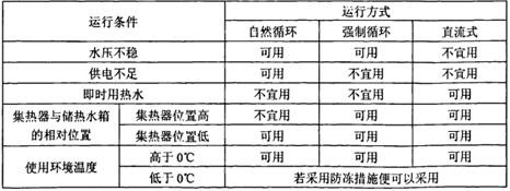 太陽熱水系統(tǒng)的運(yùn)行方式,應(yīng)根據(jù)用戶基本條件、用戶使用需求以及集熱器和儲水箱的相對安裝位置等因素來確定(如下表)。