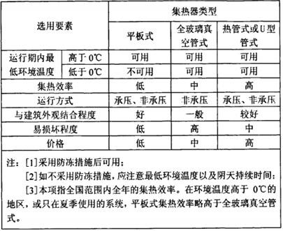 目前集熱器主要類型有全玻璃真空管式、熱管式和U型管式、平板式幾種。集熱器在選用的過程中應(yīng)該對當(dāng)?shù)靥柲苜Y源條件、環(huán)境溫度、經(jīng)濟(jì)條件、與建筑外觀結(jié)合程度、維護(hù)管理等影響因素進(jìn)行綜合考慮,選用合適的集熱器類型,選擇方法詳見下表。
