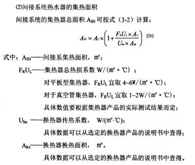 系統(tǒng)的集熱面積應(yīng)結(jié)合建筑可以提供的安裝集熱器的面積及所設(shè)定的太陽能保證率確定,并保證按照該面積配置的集熱器所采集的熱量能夠被充分利用。 通??梢园凑丈顭崴到y(tǒng)的平均R耗熱量與每m2太陽能集熱器的得熱量值之比計算。根據(jù)《民用建筑太陽能熱水系統(tǒng)應(yīng)用技術(shù)規(guī)范》 GB50364---2005的規(guī)定,按照系統(tǒng)傳熱類型有兩種計算方法: