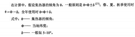 當(dāng)選擇整體式太陽能熱水器或在屋面集中布置分體式太陽能集熱器時,為了保證集熱裝置的集熱效率,我們必須計算出其最佳的采光傾斜角度,并在實際設(shè)計和安裝過程中嚴(yán)格按照這一數(shù)據(jù)選型、施工。