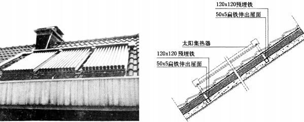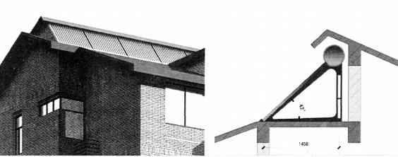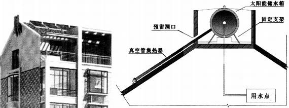 c) 結(jié)合利用傳統(tǒng)坡屋頂?shù)奈菁垢拍?,將儲水箱隱藏在屋脊中,使整體式太陽能熱水器半嵌入式布置,從而達(dá)到整體式太陽能熱水器與建筑的完美結(jié)合。