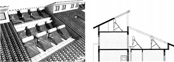 這樣做的優(yōu)點(diǎn)有 很多:(1)集熱效率高;(2)集熱器安裝在構(gòu)架上而不是屋面上,對建筑的結(jié)構(gòu)、防水、保溫不會造成破壞;(3)集熱器陣列和構(gòu)件結(jié)合,能形成很強(qiáng)的韻律 感,起到很好的裝飾作用;(4)能充分利用屋頂空間,構(gòu)架架空下的空間可以成為居民休閑娛樂的活動場所;(5)便于安裝維修而且具有一定的遮陽效果。