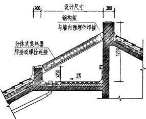 適用范圍:這種結(jié)合形式對于既有平屋頂住宅來講,一般只需采用陳列式布置,使太陽能設(shè)備看上去整齊有序、規(guī)格統(tǒng)一即可。但考慮到 結(jié)構(gòu)安全,尤其是大量安裝時,需要在屋面附加鋼橫梁,再把太陽能熱水器的支架固定在橫梁上,以避免過大的集中荷載;對于新建的平屋頂住宅,在設(shè)計階段就應(yīng) 該有意識的在屋頂設(shè)置安裝太陽能熱水器的共用安裝橋架,其安裝橋架支腳與樓板固定并伸出保溫層和防水層。安裝橋架尺寸以單元戶數(shù)為依據(jù),留出每戶安裝一臺 集熱器的位置。并在安裝橋架上預(yù)留出每戶安裝螺栓孔,針對市場太陽能熱水器自帶安裝架確定螺栓孔據(jù)。安裝橋架距屋頂防水層200mm以解決屋面雨雪排流。 安裝橋架為金屬結(jié)構(gòu),選用鋼制作。這樣,既有利于太陽能熱水器排列的整齊劃一,又避免了后置安裝對屋頂防水層、保溫層等破壞。