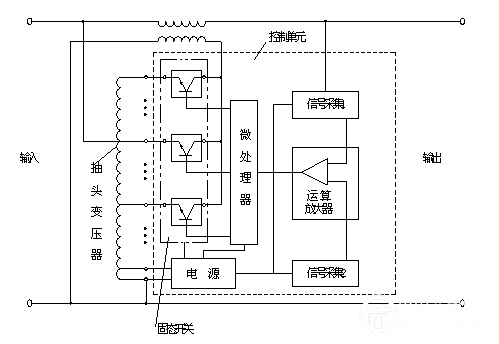 補(bǔ)償變壓器的一次繞組由電子功率部件(固態(tài)開(kāi)關(guān))與抽頭變壓器的各抽頭連接,電子功率部件擔(dān)負(fù)兩個(gè)任務(wù):①按微處理 器的指令通、斷與抽頭的連接②按微處理器的指令細(xì)分電壓——即調(diào)節(jié)導(dǎo)通程度,改變疊加電壓的幅值,以增加電壓級(jí)數(shù)和每級(jí)精度。如每級(jí)抽頭為5V,并在5V 范圍內(nèi),可再把它分為1V檔5級(jí)。由于是靠改變電子部件的導(dǎo)通程度來(lái)實(shí)現(xiàn)的,相位等參數(shù)沒(méi)有改變,所以波形畸變很小。