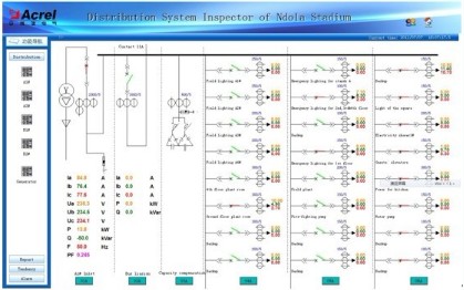 體育場的主要用電負(fù)荷為照明和應(yīng)急照明,約占到總負(fù)載的70%,其中以金鹵燈為主的場地照明占到照明負(fù)荷的60%.除照明外最大的負(fù)荷是電子大屏。援贊比亞恩多拉體育場電力監(jiān)控系統(tǒng)為Acrel-2000型。本系統(tǒng)涉及回路共112個,配電柜上安裝的儀表為上海安科瑞ACR系列及PZ系列多功能電力儀表。