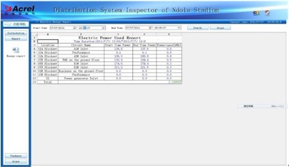 根據(jù)設(shè)計意圖,在體育場的低壓配電系統(tǒng)中,商鋪和舞臺演出部分都需要做電能計量,要求電力監(jiān)控系統(tǒng)能具有一定的電能管理功能。本系統(tǒng)提供給客戶一個能查詢電能報表并打印的界面,提供用戶查詢時間的自定義選擇然后生成電度計量報表,完成對進(jìn)線回路、商鋪回路和演出回路的電度計量。