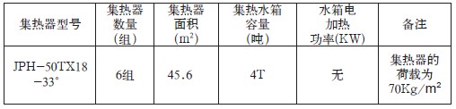 50TX18-00°型三高集熱站6組,每組面積為 7.6m2,總集熱面積45.6m2。