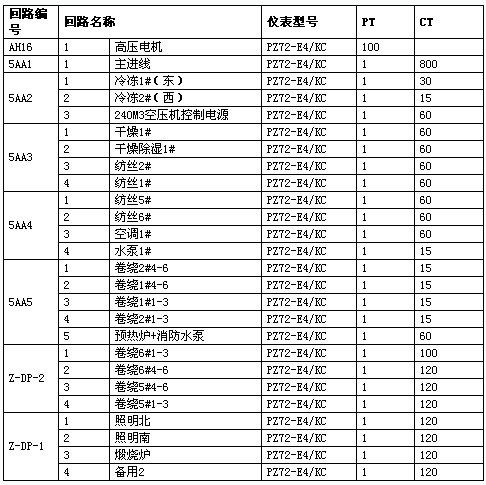 對于其他的配電柜出線回路,采用的都是PZ72-E4/KC電力儀表,PZ72-E4/KC多功能電表,為嵌入式安裝,可安裝在動力箱或低壓出線柜門板上,面板尺寸為72mm×72mm,規(guī)格為220/380V、5A,電流經(jīng)互感器接入,精度0.5級,廣泛應(yīng)用于高、低壓進(jìn)線柜、聯(lián)絡(luò)柜、出線柜、動力柜等場合,帶RS485接口,Modbus通訊協(xié)議,詳細(xì)儀表清單如表一所示: