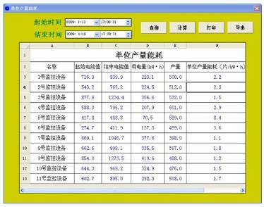 g. 單位能耗,自動計算單位產(chǎn)量能耗,并可打印及導(dǎo)出。單位產(chǎn)量能耗計算界面如圖4所示。