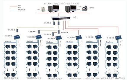 各智能電力儀表通過屏蔽雙絞線RS485接口,采用MODBUS通訊協(xié)議總線型連接接入通訊服務器。然后35kv配電室、1#配電室高低壓部分和5#配電室高低壓部分通過網(wǎng)線直接與值班室的工業(yè)交換機相連, 3#高低壓部分通過光纜直接與值班室的工業(yè)交換機相連,4#高低壓部分通過光纜先連到2#配電室,再和2#高低壓部分一起通過光纜一起連到值班室的工業(yè)交換機。最后工業(yè)交換機通過網(wǎng)線連到值班室的兩臺主機。