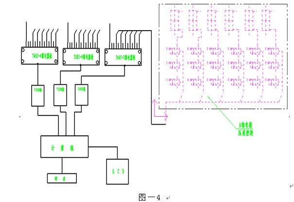 (2)GV系統(tǒng)的電極動態(tài)計算和管理功能。圖—4 是GV系統(tǒng)控制電極壓放的硬件原理圖,計算機直接驅動7685繼電器板,7685板驅動電極液壓夾鉗的松開、升起和下壓動作,完成執(zhí)行電極壓放的功能。實現(xiàn)該功能控制原理是:依據(jù)電極位置傳感器數(shù)據(jù)和電極做功點位置值的全部組合狀態(tài)值,在滿足四個邊界條件前提下(滿足電極不會出現(xiàn)軟斷和硬斷、電極升降油缸不觸及最高位置和最低位置),判斷電極長度是否滿足做功點所需長度的要求,動態(tài)調(diào)整電極壓放時間周期長短,將電極長度動態(tài)控制在冶煉需要的長度范圍內(nèi),從而實現(xiàn)不需要人工測量電極的操作。