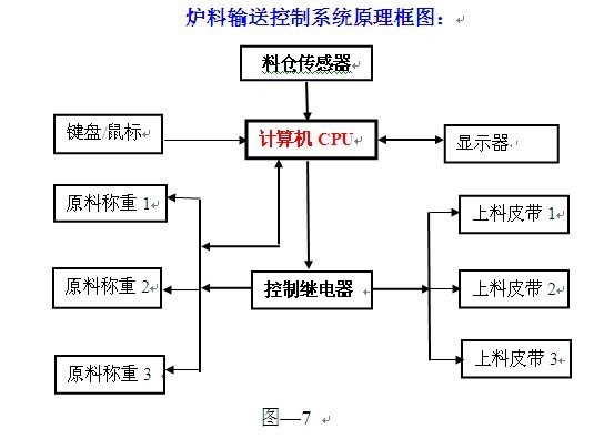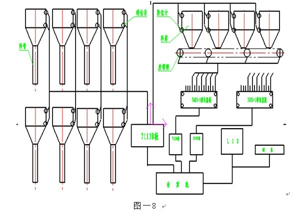 圖—8 所示為供料系統(tǒng)硬件原理圖,爐體上部料管和料斗安裝有料位計,料位計輸出DC0~5V信號給A/D板采樣轉換為數(shù)字信號供計算機計算,計算機依據(jù)料位計信 號和生產(chǎn)計劃下達的電石發(fā)氣量要求、原材料質量指標,控制7685繼電器板,驅動皮帶秤配料,并通過皮帶機輸送到爐體上部的料管內(nèi)。