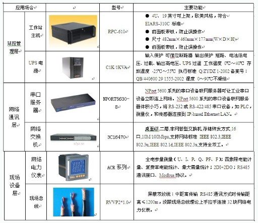 對歐木特種紙業(yè)有限公司提出的需求和我們確定的組網(wǎng)方案,站控管理層設備層采購華北工控的工業(yè)主機,聯(lián)想的顯示器,SANTAK的UPS以及HP的打印機;網(wǎng)絡通訊層使用MOXA的NPORT5630-8串口服務器,3C16470網(wǎng)絡交換機;現(xiàn)場設備層采上海安科瑞公司ACR系列網(wǎng)絡電力儀表,總線鋪設屏蔽雙絞線,以滿足系統(tǒng)組網(wǎng)的要求,具體設備如下表: