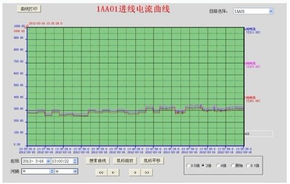 4.3趨勢曲線:各重要回路電流、功率實時趨勢顯示及歷史趨勢查詢功能。選擇回路后,該回路實時趨勢曲線會不斷刷新,選擇“起始時間”可查看該回路歷史趨勢曲線,選擇“時間長度”可查看歷史日、月、年趨勢曲線,能更加直觀反映該回路運行情況。