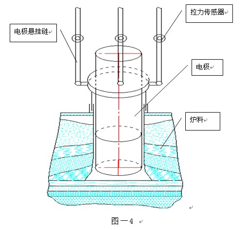 “黃磷爐電極狀態(tài)自動識別和處理技術(shù)”的控制原理是:在每根電極的三條吊鏈上各加裝一個50KN的拉力傳感器,如下圖 所示,傳感器輸出0-5V直流電壓信號給計算機(jī)A/D板,計算機(jī)對每個傳感器的拉力大小進(jìn)行判斷計算,借此自動識別電極的狀態(tài)知否正常、偏斜并告知操作人 員,從而使操作人員能及時、準(zhǔn)確地進(jìn)行分析、判斷電極周圍的爐料狀態(tài)是否均勻,為下一步生產(chǎn)操作提供可行調(diào)整措施,徹底解決電極偏斜和折斷等問題。
