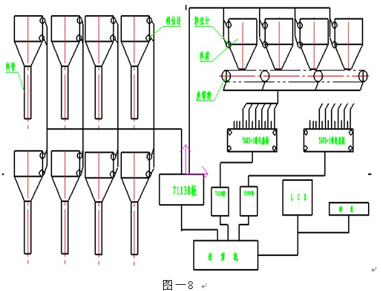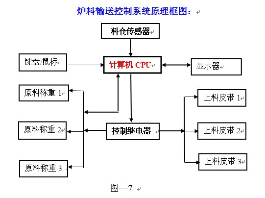圖—8 所示為供料系統(tǒng)硬件原理圖,爐體上部料管和料斗安裝有料位計,料位計輸出DC0~5V信號給A/D板采樣轉(zhuǎn)換為數(shù)字信號供計算機(jī)計算,計算機(jī)依據(jù)料位計信 號和生產(chǎn)計劃下達(dá)的電石發(fā)氣量要求、原材料質(zhì)量指標(biāo),控制7685繼電器板,驅(qū)動皮帶秤配料,并通過皮帶機(jī)輸送到爐體上部的料管內(nèi)。