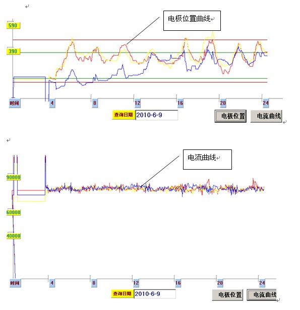 GV系統(tǒng)設(shè)計了電極拉力值曲線顯示功能和電流曲線顯示功能,可以方便分析電極偏斜情況和黃磷爐做功的情況。依此功能,可以優(yōu)化黃磷爐的多項運(yùn)行參數(shù),為黃磷爐能夠按照最佳參數(shù)運(yùn)行提供了可靠保證。