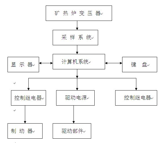 流、功率,計(jì)算機(jī)控制系統(tǒng)將自動(dòng)地實(shí)時(shí)地檢測(cè)到的參數(shù)值(電壓、電流)進(jìn)行A/D轉(zhuǎn)換后與設(shè)定值進(jìn)行三相平衡和比較運(yùn)算,并根據(jù)控制數(shù)學(xué)模型、控制策略和 異常爐況模型進(jìn)行分析判斷,然后發(fā)出一組指令給變頻器(電磁閥控制模塊)和控制繼電器。變頻器(電磁閥控制模塊)將相應(yīng)的指令變換為對(duì)應(yīng)頻率和對(duì)應(yīng)極性, 以驅(qū)動(dòng)電機(jī)轉(zhuǎn)動(dòng)(液壓油缸)進(jìn)而帶動(dòng)電極上下運(yùn)動(dòng),改變弧流、功率大小,使系統(tǒng)迅速地糾正偏差,維持其運(yùn)行在給定范圍。