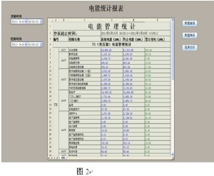 對信號采集系統(tǒng)所采集實時數(shù)據(jù)進行統(tǒng)計、分析、計算,將數(shù)據(jù)進行定時存儲。并通過計算產(chǎn)生每日/周/月/年用電量;每日/周/月/年最大負荷及最大負荷出現(xiàn)時間,對存在故障隱患的設(shè)備及時提出整改;通過電能分時計量累計電費,對不合理用電單位提出科學合理的改進;通過邏輯運算計算出設(shè)備正常、異常出現(xiàn)次數(shù),存儲事故發(fā)生時間、原因。電能報表如圖2所示: