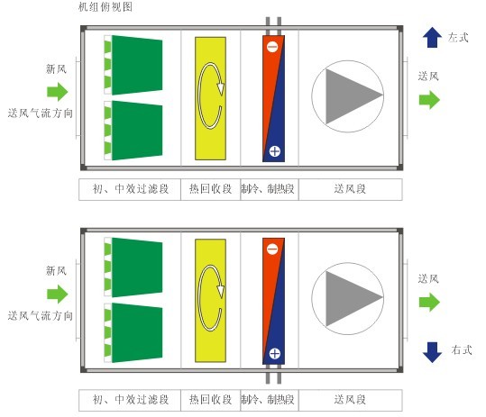 提供板翅和轉(zhuǎn)輪兩種熱回收裝置。板翅式熱回收無需驅(qū)動(dòng)裝置,采用叉流式換熱,換熱充分,具有較高的換熱效率;轉(zhuǎn)輪式熱回收采用直流換熱,轉(zhuǎn)輪芯體是一個(gè)以勻速轉(zhuǎn)動(dòng)的蜂窩狀裝置,顯熱芯體以金屬鋁箔為載體,全熱芯體在鋁箔上覆著3A分子篩,具有較強(qiáng)的吸熱、吸濕效率。
