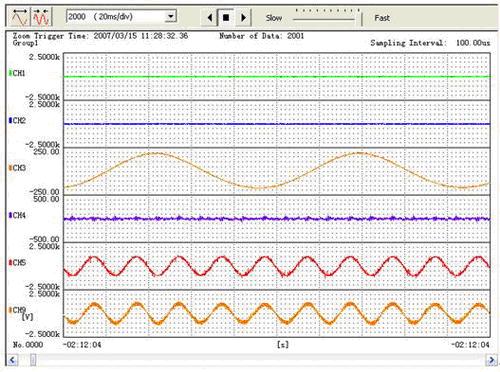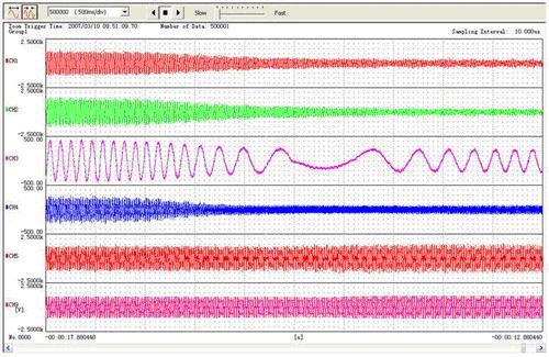 圖3至圖5為在上海某電機廠地面實驗的試驗波形,圖中從上到下,依次為CH1-CH6,CH1為電網(wǎng)電流A相,流向電網(wǎng)為正;CH2為定子電流A相,定子 繞組流出為正;CH3為轉(zhuǎn)子電流A相,變流器流出為正;CH4為整流電流A相,流入變流器為正;CH5為電網(wǎng)電壓BC相,(CH9)CH6為定子電壓BC 相。