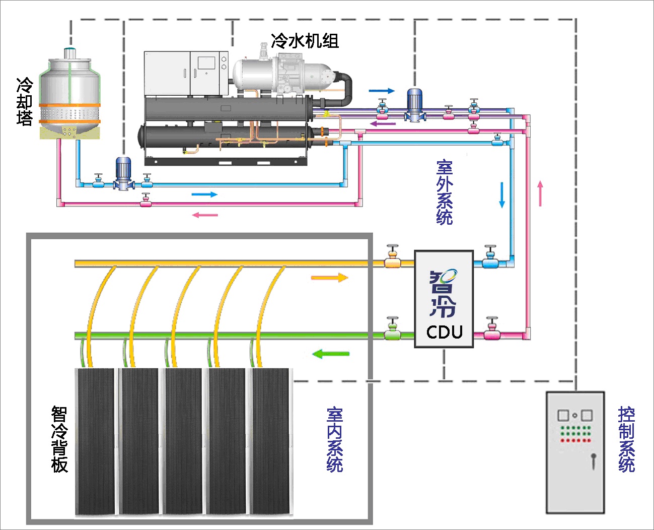 機 柜內(nèi)設備排出的熱風與安裝在機柜背后的智冷終端內(nèi)的環(huán)保循環(huán)工質(zhì)間接進行熱交換后變成冷風排到室內(nèi)環(huán)境。智冷終端內(nèi)循環(huán)工質(zhì)通過相變傳熱,受熱由氣態(tài)變成 液態(tài),依靠微小壓差沿制冷劑氣體管路將熱量帶室外系統(tǒng)的CDU,在CDU內(nèi)與室外系統(tǒng)的冷源設備提供的冷水進行熱交換,循環(huán)工質(zhì)受冷由氣態(tài)變成液態(tài),依靠 自身重力沿制冷劑液體管路流回智冷終端完成一個完整的熱力循環(huán),熱量的傳遞依此順序源源不斷的傳遞到室外。室外系統(tǒng)為室內(nèi)系統(tǒng)提供冷凍水,提供的冷凍水與 循環(huán)工質(zhì)在CDU內(nèi)進行熱交換。由閉式冷卻塔、冷水機組根據(jù)各自項目的特點組合的冷源系統(tǒng)提供系統(tǒng)所需的冷水,安裝閉式冷卻塔時可在低溫季節(jié)實現(xiàn)對自然冷 源的充分利用。