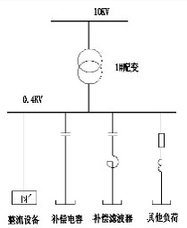 某化工廠2010年負(fù)荷配電變壓器容量5.2MVA,有1.6MVA配電變壓器兩臺,2.0MVA配電變壓器一臺,配電變壓器高壓側(cè)電壓10kV,低壓側(cè)為0.4kV,產(chǎn)生諧波的設(shè)備主要是整流柜,整流設(shè)備容量為1.344MVA.集中接于1號配變的(1.6MVA)0.4kV側(cè),如簡圖1所示。整流設(shè)備產(chǎn)生的主要諧波電流有5次、7次、11次、13次電流,其實(shí)測值見表1.