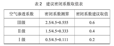 (2)密閉系數(shù)的確定和應(yīng)用:建筑物由門窗縫隙滲入的冷空氣量是由門窗兩側(cè)所存在的風(fēng)壓差和熱壓差所決定的,一般來說,風(fēng)壓差和熱壓差與建筑物的型 式、門窗所處的高度、朝向及室內(nèi)外溫差等因素有關(guān)。密閉系數(shù)(采取密閉的各種窗型測(cè)出的氣密性數(shù)據(jù)與未加密閉處理的窗型氣密性數(shù)據(jù)相比)見表1、表2。