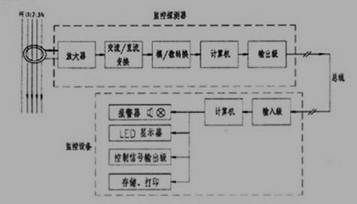 電流互感器為傳感器件,由它提取的漏電信號(hào),經(jīng)放大、AC/DC變換、A/D變換、CPU處理后,送至輸出級(jí)。輸出信號(hào)經(jīng)總線輸往監(jiān)控設(shè)備。監(jiān)控設(shè)備接收的漏電信息經(jīng)CPU處理后,送往報(bào)警器、顯示器、信號(hào)輸出級(jí)。報(bào)警器由報(bào)警指示燈、蜂鳴器組成,顯示器由三位數(shù)碼管(LED)組成,用以顯示漏電電流大小,信號(hào)輸出級(jí)輸出各種報(bào)警及控制信號(hào),用于附加報(bào)警及切斷電源等。監(jiān)控設(shè)備還有信號(hào)存儲(chǔ)及打印功能,供隨時(shí)查詢。