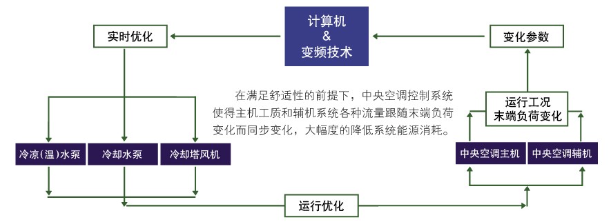 采用負荷隨動跟蹤方式,運用計算機和變頻技術,根據中央空調主機和輔機系統(tǒng)運行工況和末端負荷的變化,采集多種變化參數(shù)。然后通過負荷隨動計算,自 動對冷凍(溫)水泵,冷卻水泵,冷卻塔風機等設備進行實時優(yōu)化控制,并使中央空調主機運行環(huán)境得以優(yōu)化。使得主機工質和輔機系統(tǒng)各種流體流量跟隨末端負荷 變化而同步變化,確保中央空調系統(tǒng)滿足舒適的前提下,大幅度的降低系統(tǒng)能源消耗。