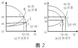 圖2( a) 為水泵節(jié)流調(diào)節(jié)特性,節(jié)流調(diào)節(jié)中當(dāng)出口調(diào)節(jié)門開度調(diào)小,管路特性曲線由I 變?yōu)棰颉Ec水泵特性曲線交點由2 變?yōu)?,耗能分別為0Q22H2,0Q11H1。