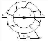 低壓電流互感器的工作原理如圖1所示,電流互感器的一次繞組串聯(lián)在被測線路中,I1為線路電流即電流互感器的一次電流,N1為電流互感器的一次匝數(shù),I2電流互感器二次電流(通常為5A、1A),N2為電流互感器的二次匝數(shù),Z2e為二次回路設備及連接導線阻抗。當一次電流從電流互感器P1端流進,P2端出,在二次Z2e接通的情況下,由電磁感應原理,電流互感器二次繞組有電流I2從S1流過,經(jīng)Z2e至S2,形成閉合回路。由此可得電流在理想狀態(tài)下I1×N1=I2×N2,所以有I1/I2=N1/N2=K,K為電流互感器的變比。