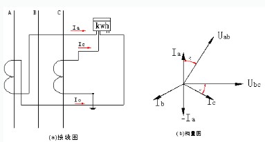 正確接線時的有功功率為:P=Pa+ Pc =UabIa.cos(30°+φa)+ Ucb.Ic.cos(30°-φc);三相電路平衡時,Uab=Ucb=√3U,Ia=Ic=√3I,即,P=3UI cosφ;假如A相電流互感器極性接反,祥見接線圖(a)和相量圖(b)