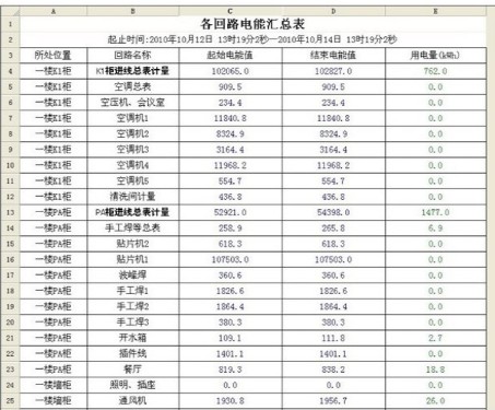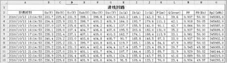 圖7為某段時間內(nèi)的進線回路各項參數(shù)的具體數(shù)值,它詳細地記錄了進線回路三相電壓、電流、有功電能、無功能電能、功率因素、頻率參數(shù)。整個廠區(qū)各回路電能匯總?cè)鐖D8所示,它記錄了某段時間內(nèi)各個回路的耗電情況,包括各回路進行柜的總電能及分支電能。