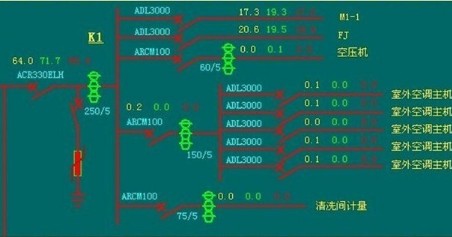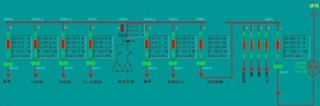 圖5為該廠區(qū)進線回路配電圖,圖上顯示的參數(shù)都是主站軟件通過ZigBee無線網(wǎng)絡采集的各回路電力參數(shù)。圖6是廠區(qū)幾個主要配電柜的配電柜中K1柜的配電圖。圖上詳細顯示了K1配電柜各個回路的電力參數(shù)值,便于管理員更詳細的了解工廠的用電情況。