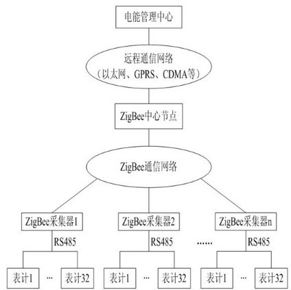圖3為基于ZigBee配電管理系統(tǒng)系統(tǒng)框圖,整個系統(tǒng)由一個ZigBee網(wǎng)絡終端和若干個ZigBee采集器組成。ZigBee網(wǎng)絡終端是整個ZigBee網(wǎng)絡的協(xié)調(diào)者(ZigBee中心節(jié)點),它是整個ZigBee網(wǎng)絡的發(fā)起者,它還負責與配電管理中心的數(shù)據(jù)交互,主要采用以太網(wǎng)、GPRS或CDMA等遠距離通信方式。ZigBee采集器在ZigBee網(wǎng)絡中起到采集數(shù)據(jù)和網(wǎng)絡路由的作用,每個ZigBee采集器的485總線上最多能連接32個表計。系統(tǒng)中所有表計和主站軟件都是采用MODBUS-RTU通信協(xié)議來通信的(2)。