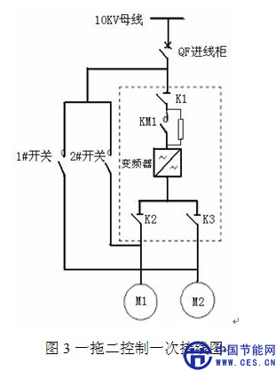 現(xiàn)場(chǎng)采用一套山東新風(fēng)光電子科技發(fā)展有限公司生產(chǎn)的JD-BP38-710P高壓變頻調(diào)速系統(tǒng),額定電壓10kV,額定電流51A,額定功率710kW,采用“一拖二”控制方案,主回路控制接線如圖3所示: