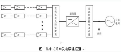 這種并網(wǎng)方式適合于在建筑物上安裝朝向相同且規(guī)格相同的光伏陣列,在電氣設計時,采用單臺逆變器集中并網(wǎng)發(fā)電方案實現(xiàn)聯(lián)網(wǎng)功能,如圖3所示。