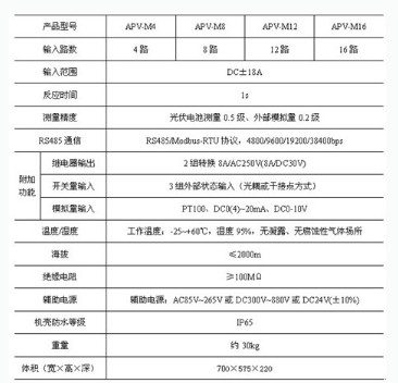 在光伏發(fā)電系統(tǒng)中,數(shù)量龐大的光伏電池組件進行串并組合達到需要的電壓電流值,以使發(fā)電效率達到最佳。APV-M系列智能光伏匯流箱主要作用就是對光伏電池陣列的輸入進行一級匯流,用于減少光電池陣列接入到逆變器的連線,優(yōu)化系統(tǒng)結構,提高可靠性和可維護性。在提供匯流防雷功能的同時,還監(jiān)測了光電池板運行狀態(tài),匯流后電流、電壓、功率,防雷器狀態(tài)、直流斷路器狀態(tài)采集,繼電器接點輸出等功能,并帶有風速、溫度、輻照儀等傳感器接口功能供客戶選擇,裝置標配有RS485接口,可以把測量和采集到的數(shù)據(jù)上傳到監(jiān)控系統(tǒng)。