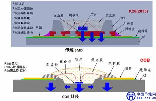 傳統(tǒng)SMD封裝應(yīng)用的系統(tǒng)熱阻為:芯片-固晶膠-焊點(diǎn)-錫膏-銅箔-絕緣層-鋁材。COB封裝的系統(tǒng)熱阻為:芯片-固晶膠-鋁材。COB封裝的系統(tǒng)熱阻要遠(yuǎn)低于傳統(tǒng)SMD封裝的系統(tǒng)熱阻,大幅度提高了LED的壽命。